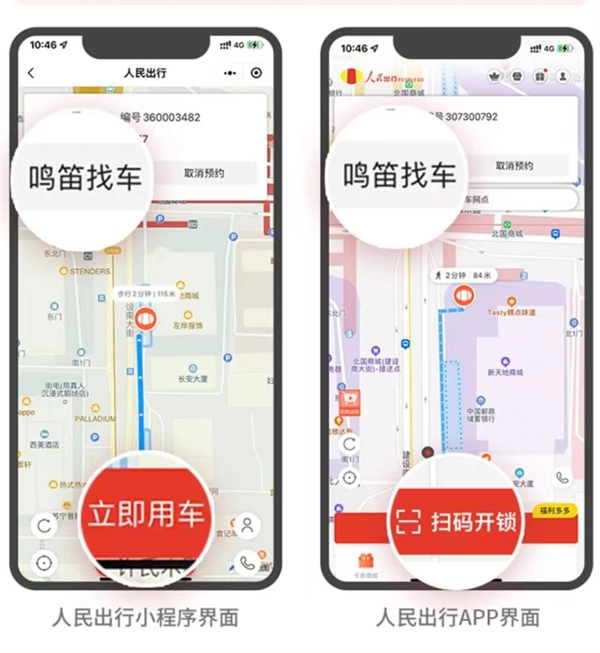 你可以通过线下寻找,或者打开人民出行小程序、人民出行应用,找到附近的可用车辆。点击车辆后,就能查看它的可骑行里程和价格,还可以进行预约用车操作(预约最多能保留10分钟)。