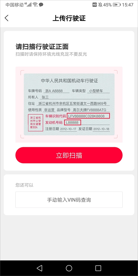 扫描时请确保环境光线明亮且无反光,仅需扫描行驶证正面;若环境条件不理想,也可手动输入VIN码完成查询添加操作。