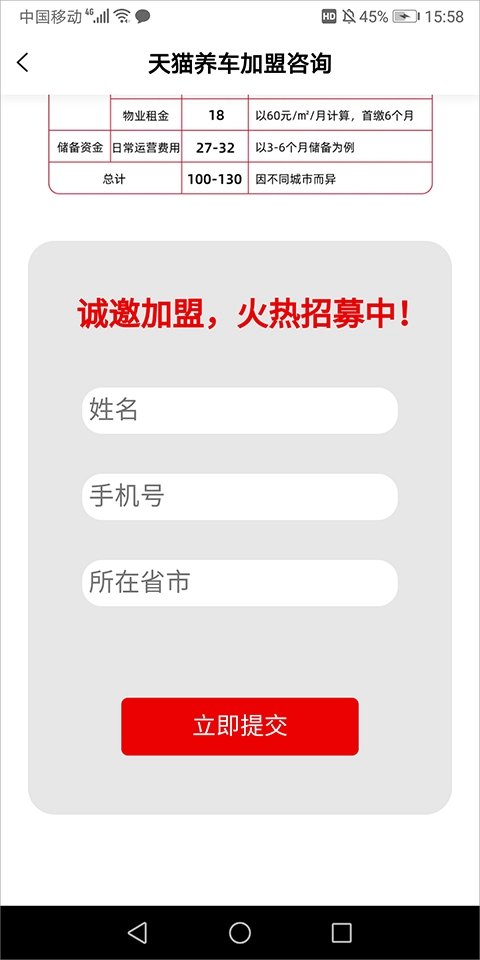 在前面提到的一站式养车服务里,天猫养车的所有门店,每个工位都配备了监控设备。车主不用守在车旁,就能通过云直播观看维修的全过程,而且录像会保留30天,方便用户后续处理售后问题或进行维权。 养车过程中,系统还会结合车辆的实际使用数据和原厂保养标准,智能提示车辆可能存在的隐患,并给出对应的解决方案,帮助用户更精准、高效地养护车辆。 另外,天猫养车能调用98%主流车型的原厂保养数据,为用户的车辆匹配精准的养车方案,避免过度保养或者“小病大修”的情况,让用户养车更合理。 对于有意向加入平台的商家,天猫养车也提供了加盟通道。商家只需进入平台的“我的”页面,点击“门店加盟”,填写姓名和手机号,平台就会安排工作人员联系对接,推进加盟事宜。有养车需求的用户和想加盟的商家,都可以来这里体验和办理相关业务。