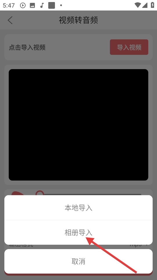 在【视频转音频】功能的导入选项里,选择【相册导入】就能从相册中选取视频。