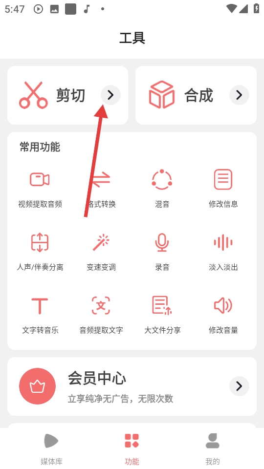 在工具界面中,点击【剪切】按钮即可进入音频剪切功能板块。