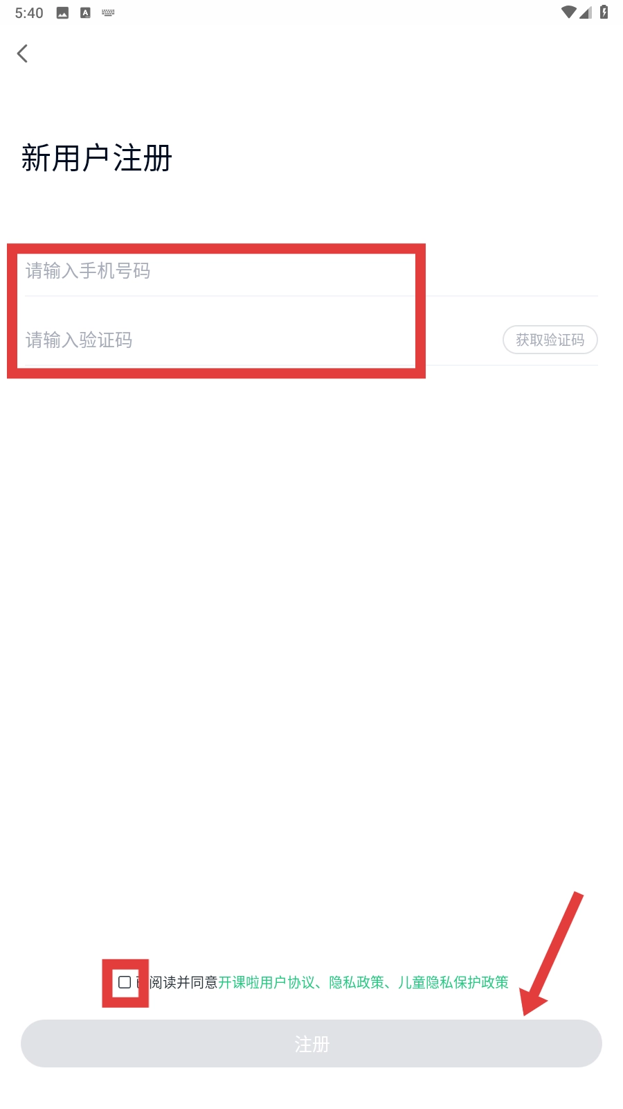 在新用户注册页面,输入手机号码并填写验证码,勾选相关协议后点击【注册】按钮,即可完成整个注册流程。