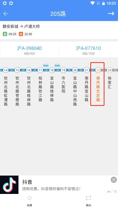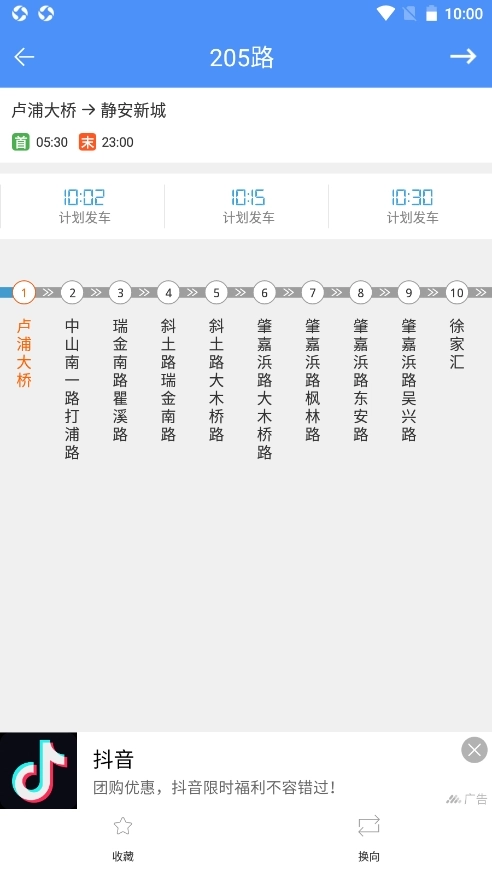 比如205路公交车,能查看它途经的站点和发车时间;要是常坐这路车,可点击下方的【收藏】按钮;点击【换向】就能查看从静安新城开往卢浦大桥方向的发车时间。