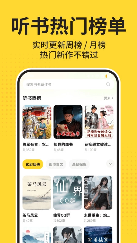 完成安装后,进入首页即可获取更多题材的听书资源,同时还能看到听书热榜内容的展示。