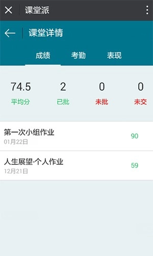进入“课堂详情”页面后,查看课程作业的批改状态,并且统计出平均分,以及已批改、未批改和未提交的次数。