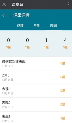在表现模块中,会展示学生的表现情况,并对每次获得的3星、2星、1星和0星的次数进行统计。