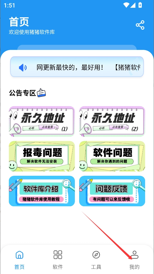 猪猪软件库设有四个板块,其中首页板块包含公告专区,用户可在此查看永久地址并了解软件相关问题。