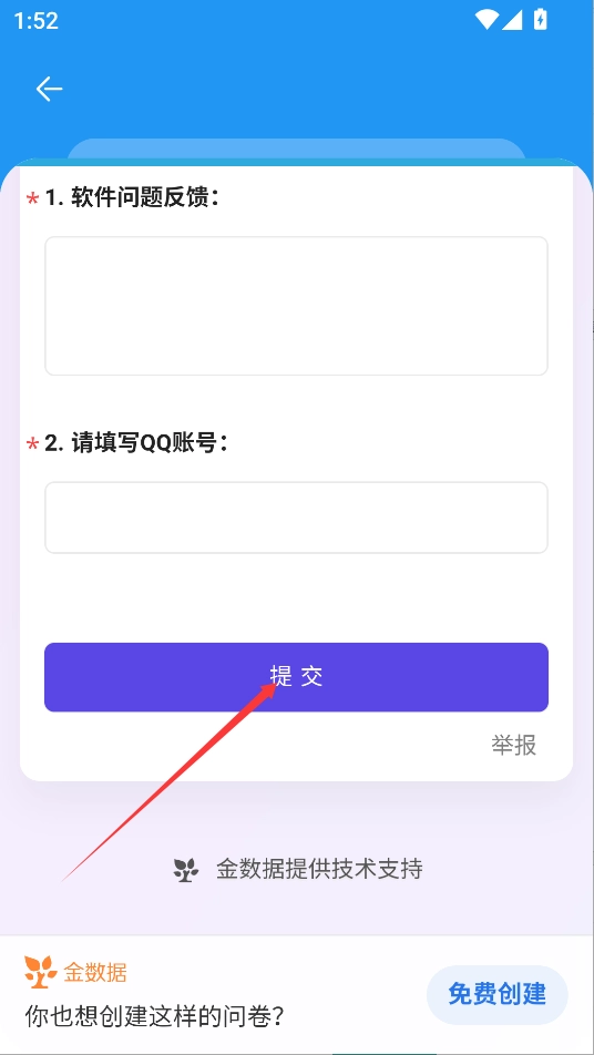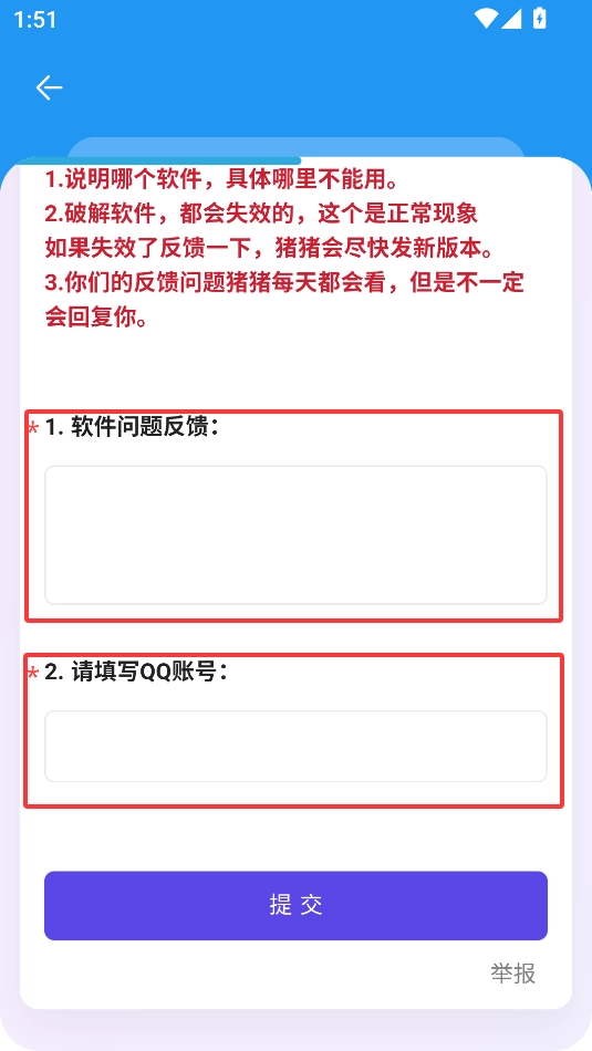 填写软件问题反馈和QQ账号在选框里面
