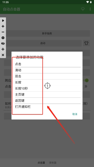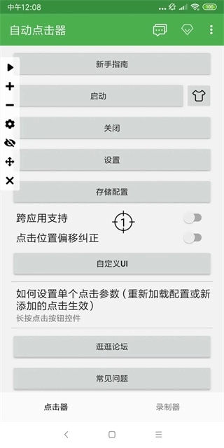 点击启动后,中间的图标能够自由移动,左侧的工具栏可用于设置自动点击功能。