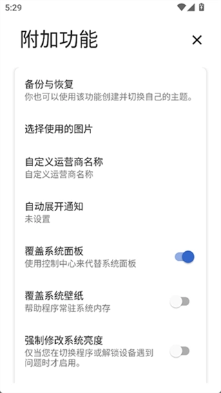 在附加功能板块里,用户能够自行设置是否开启覆盖系统面板、覆盖系统壁纸以及保持自动亮度的功能。