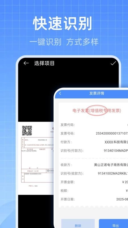 通过一键识别功能,就能快速识别相关发票,轻松提取发票信息。