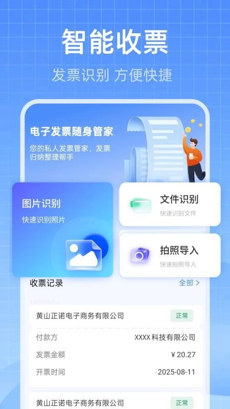 电子发票随身管家能帮助用户轻松管理发票,它配备了贴心的发票识别功能,可智能收票,方便用户快速查看、归档整理,让发票管理更简单;此外,用户还能实时记录开销与财务账单,轻松完成记账。