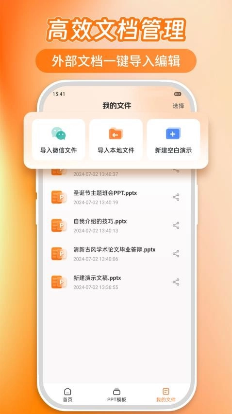 PPT模板君是一款十分优质且实用的PPT文档编辑办公软件。该软件了丰富多样的PPT制作模板,覆盖工作总结、课程教育、述职报告等多种应用场景,能够最大程度满足用户对PPT模板的使用需求。用户可随时在软件中挑选所需模板进行在线编辑,快速完成心仪的PPT演示文稿制作,操作极为便捷。此外,PPT模板君手机版还具备高效的文档管理功能,用户能一键导入外部文档进行编辑与管理,便于快速查找所需文件。有需要的用户不妨立即在本站下载体验这款软件!