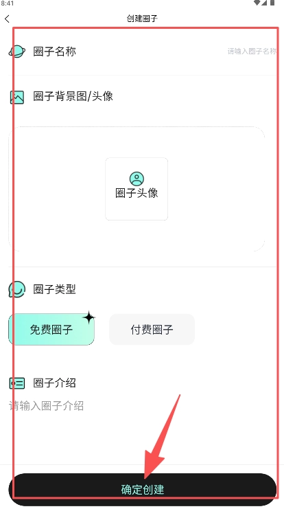 在创建页面填写圈子名称、选择类型并上传头像后,点击底部的“确定创建”按钮即可完成操作。