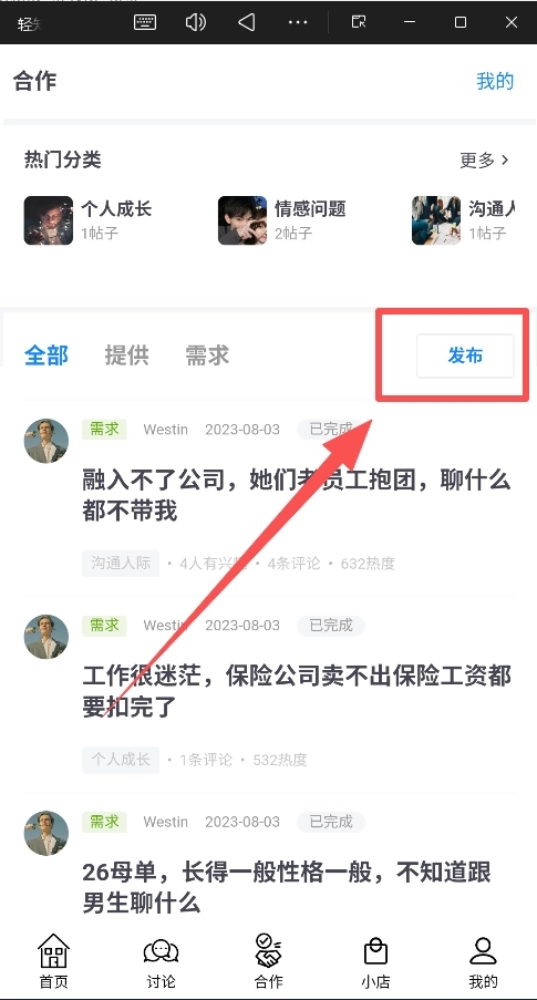 要是没找到答案,你可以前往“合作”页面发布一条详细的“需求”帖子,向社区寻求帮助。