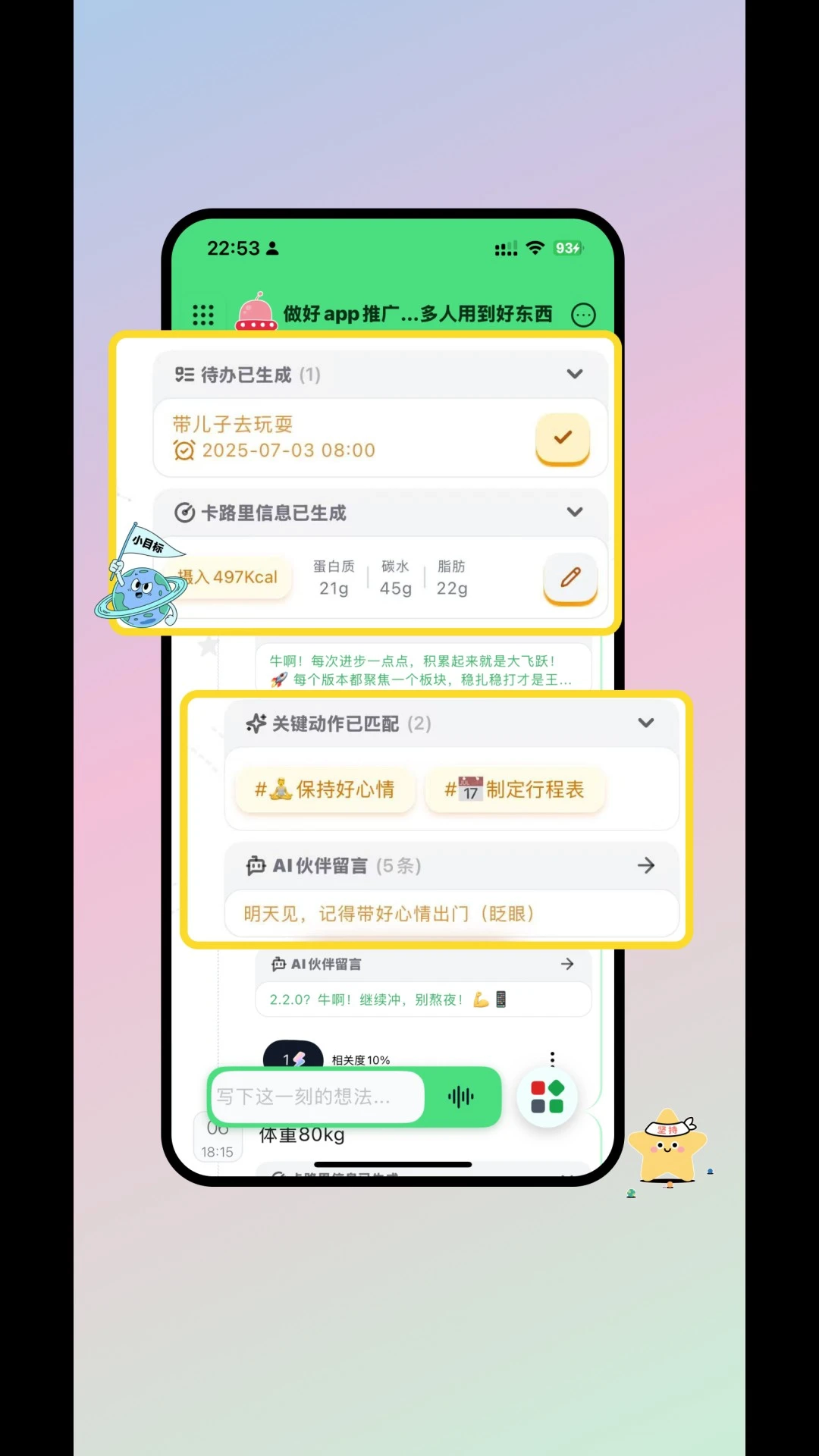 AI能够智能拆解待办事项、心情状态、饮食情况以及关键动作等内容,并且可以对这些信息进行数据可视化分析,同时提供AI洞察。