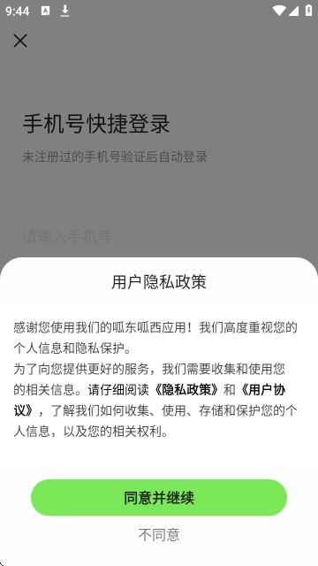 打开呱东呱西应用,仔细阅读《用户隐私政策》与《用户协议》,随后点击“同意并继续”按钮,即可进入手机号快捷登录的界面。