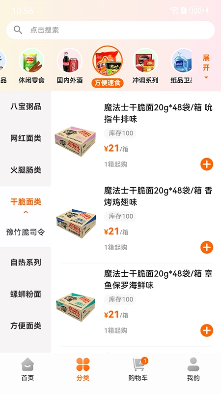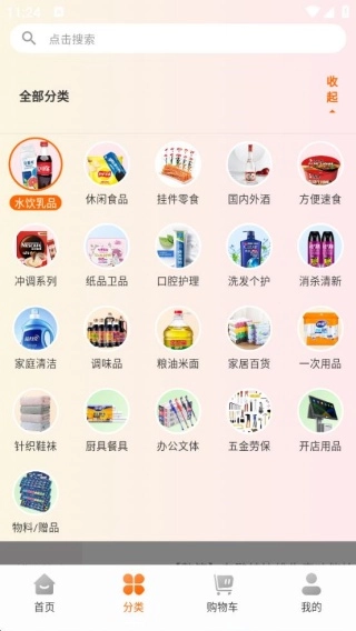 点击分类,这里有水饮乳品、休闲食品、挂件零食、国内外酒、方便速食等各类商品可供选择,若有购买需求,现在就可以添加选购。
