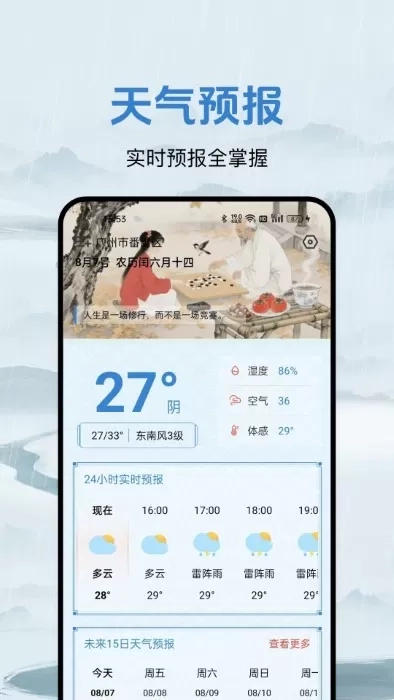 便捷查看24小时天气动态,提前防范早晚温差悬殊。