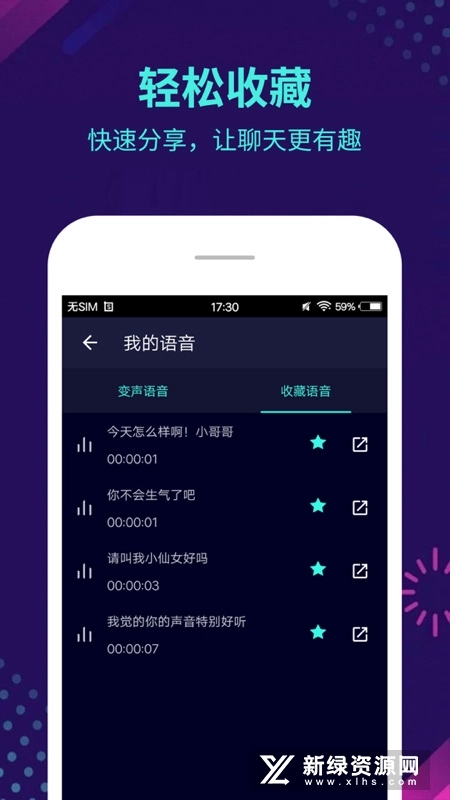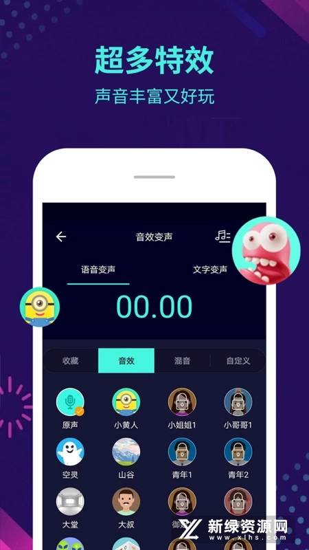 多种变声效果可选:爷爷、大叔、小孩、幽灵、机器人...... 变声时只需轻轻一点,让你成为自带BGM的潮人