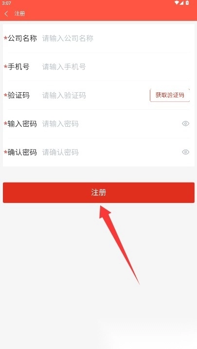 填写公司名称、手机号码与验证码,设置登录密码后点击注册按钮,即可完成账号创建。