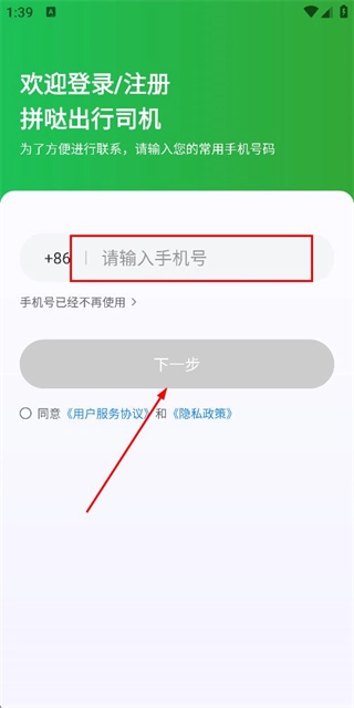 在登录界面输入手机号码,勾选相关协议后,点击“下一步”按钮以获取验证码。