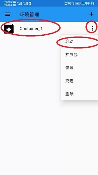 第三步、进入模拟器后,会出现一个空白的界面,你需要点击桌面左上角的三条杠,然后点击环境管理,在新的页面中点击三个竖着的点点,然后点击启动,就等待程序启动。