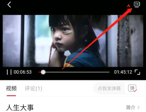 在视频播放界面,点击右上角的【TV】按钮,接着在弹出的选项页面里点击【投屏】按钮。