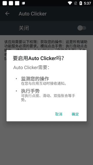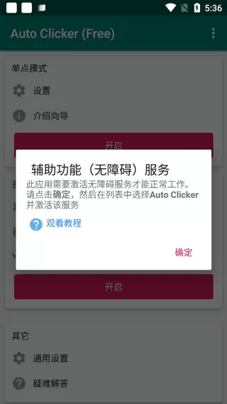 1. 开启Auto Clicker连点器,初次进入该应用时,系统会自动弹出提示询问是否开启无障碍服务,点击【确定】选项。