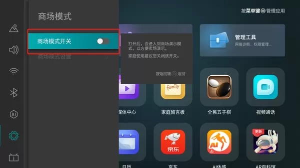 4、进入通用设置,点击商场模式,把状态调整为“开启”。若未开启,在媒体中心里,安装包文件将不会显示。