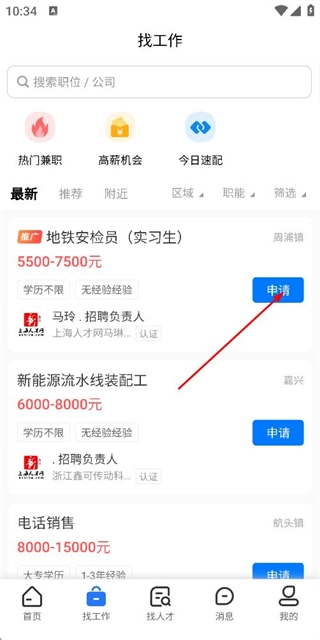 在上海人才网首页,点击底部的“找工作”选项,即可进入职位列表页面。