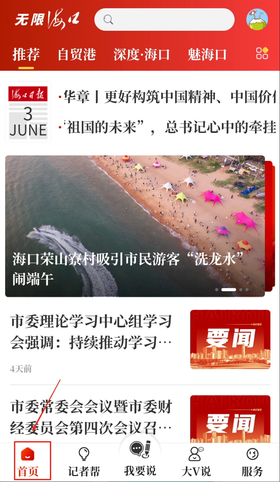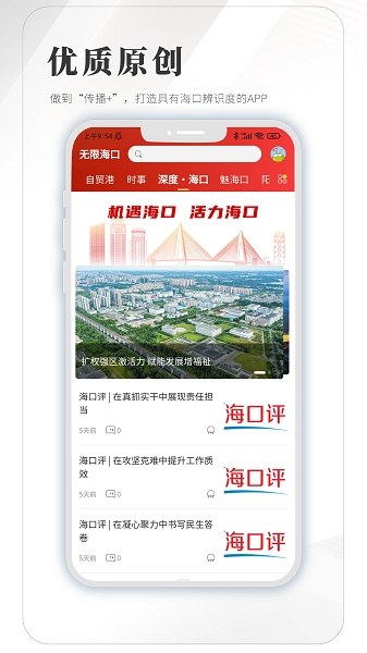 首页的栏目导航包含推荐、自贸港、时事等板块,通过滑动浏览就能了解海口的最新动态和深度报道。