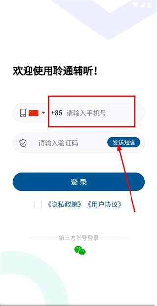 在手机登录界面输入手机号,勾选相关协议后,点击发送短信验证码。