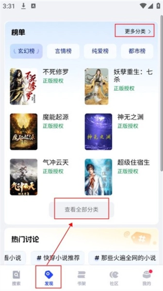 安装必访后打开软件,进入【发现】专区。在这里,你可以通过榜单推荐找到自己喜欢的作品,也可以点击“查看全部分类”或“更多分类”进行浏览。