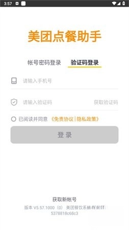 首先启动美团点餐助手应用程序,待软件加载完成后,会出现账号密码登录与验证码登录这两种可供选择的登录方式。