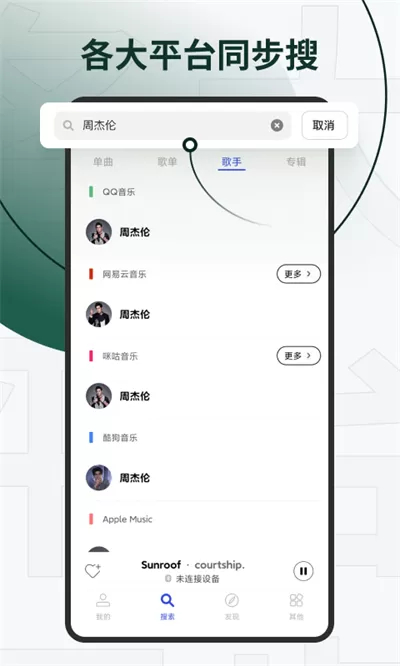支持在QQ音乐、网易云、酷狗、酷我、咪咕等平台进行聚合搜歌,让找歌变得更为便捷。