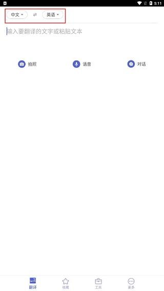 这款软件的操作界面与谷歌翻译颇为相似,整体设计简洁清爽,首页设有翻译、收藏、工具和更多这四项基础功能。