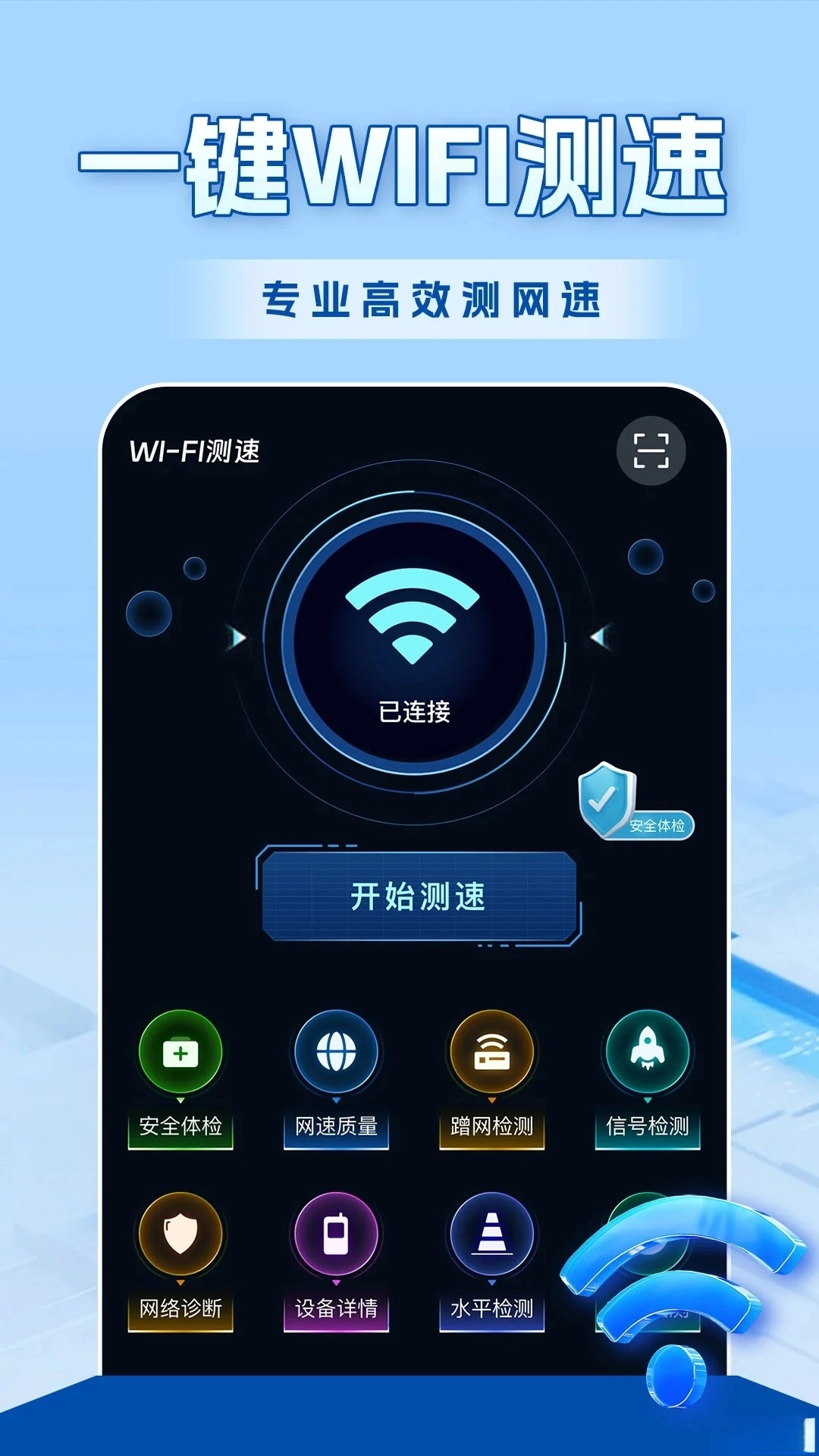 简洁直观的操作界面:软件界面设计简洁明了,操作流程直观易懂。各个功能模块一目了然,即使是不熟悉电子设备的用户也能轻松上手。无论是测速、检测蹭网还是诊断网络问题,都能在几步操作内完成,节省用户的时间和精力。