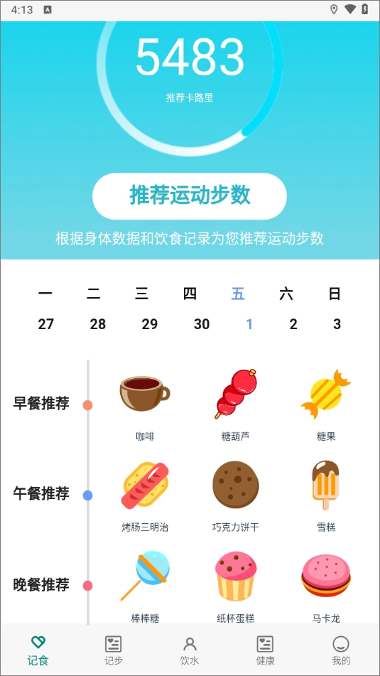 会依据用户的基本信息,为你提供推荐的运动步数,还有早餐、午餐、晚餐的推荐,用户可以一键添加这些内容。