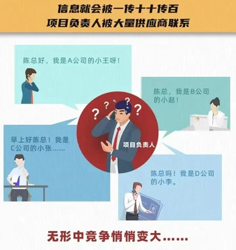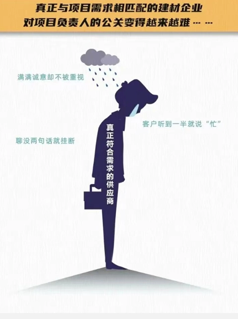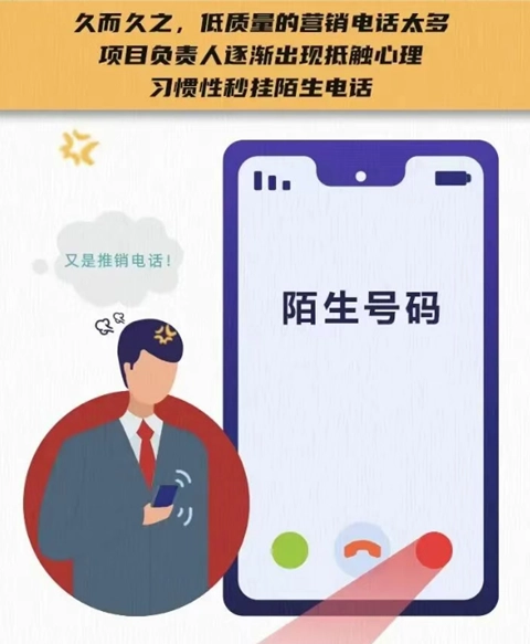 大部分销售企业会依据产品特性与定位,筛选出较为匹配的项目开展跟进工作。不过,部分企业的业务人员在未做分析的情况下,盲目地大范围扫查项目,有时还会出现同一公司不同业务人员多次联系同一项目负责人的情况;更有甚者,一些销售人员会把项目负责人的电话发到朋友群,致使该负责人短时间内频繁接听大量电话,不堪其扰。这些行为不仅会对项目负责人造成骚扰,让他们养成习惯性挂断陌生号码的习惯,还会大幅增加那些真正符合项目需求的建材企业的项目跟进难度。