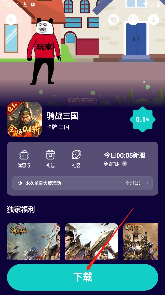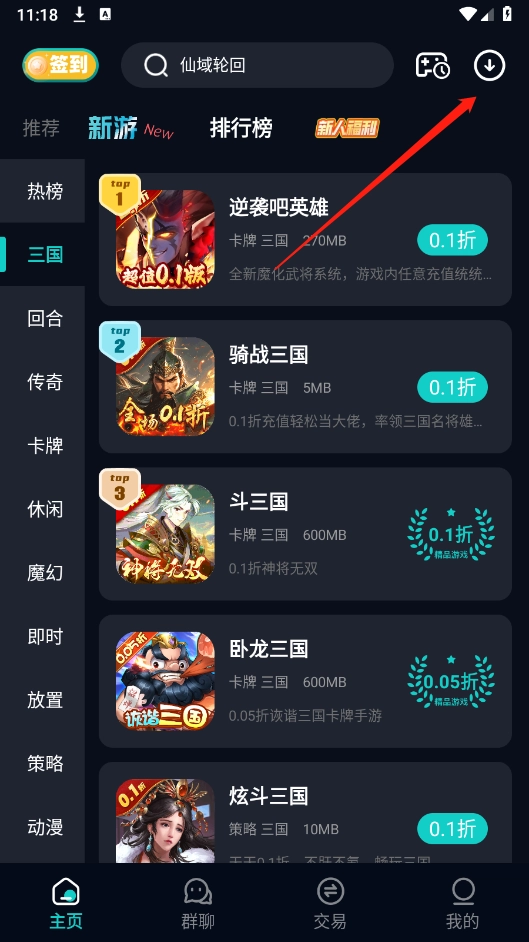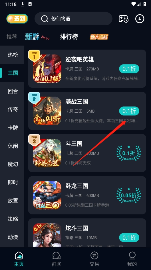 进入首页后,挑选自己喜爱的游戏资源,就像小编选的《骑战三国》这样。
