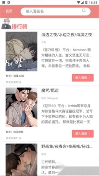 点击排行榜进入,可以查看当前热门受欢迎的漫画。