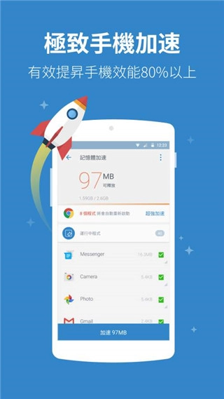 内存优化方面,电源清洁功能能够智能关闭后台运行的应用程序并清理内存,从而有效提升手机的运行速度,同时延长电池的使用寿命。