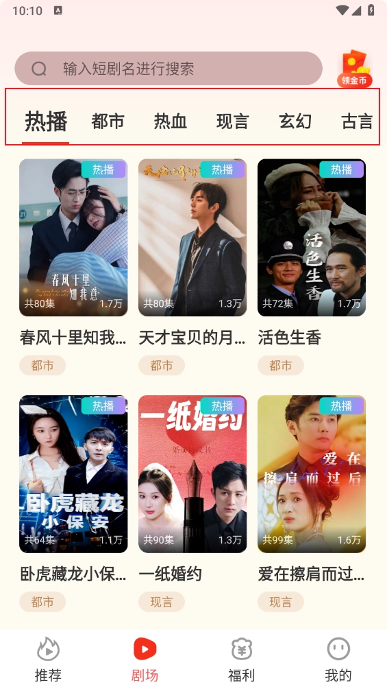 进入"剧场"板块,涵盖了多个题材的热门短剧资源。