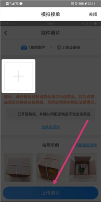 上门取件时,先点击“我已就位”,接着点击验证取件;随后对配送物品拍照并上传,需确保物品完整入镜。若为二次包装的物品,应开箱验货并拍摄物品本身,不可仅拍外包装;对于封口的餐饮订单,则需拍摄两张照片,一张是小票单独照,另一张是物品与小票的组合照,且两者都要完整拍入画面。