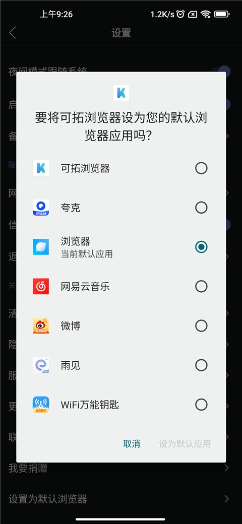 在“设置”页面选择“设置为默认浏览器”。