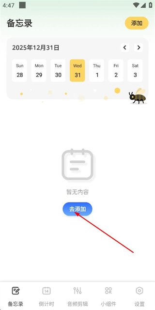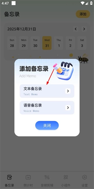 在备忘录首页点击“去添加”按钮,系统会弹出添加备忘录的选项菜单。