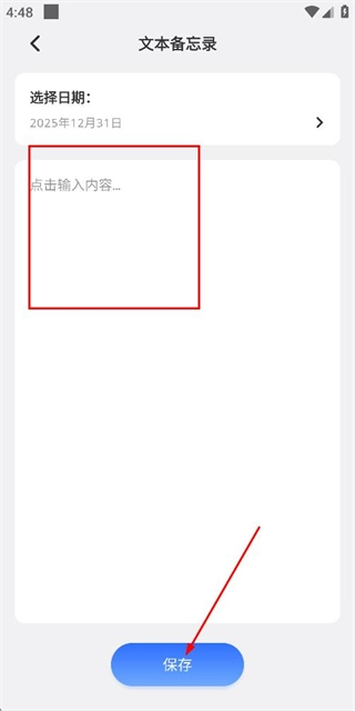 在文本备忘录的编辑界面输入内容后,点击保存按钮即可完成文本备忘录的添加操作。