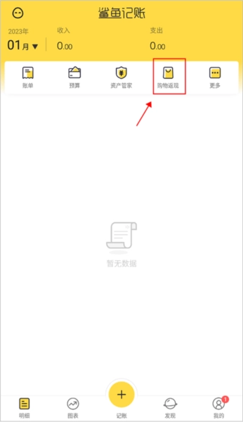 首先打开鲨鱼记账,在明细页面,点击【购物返现】。