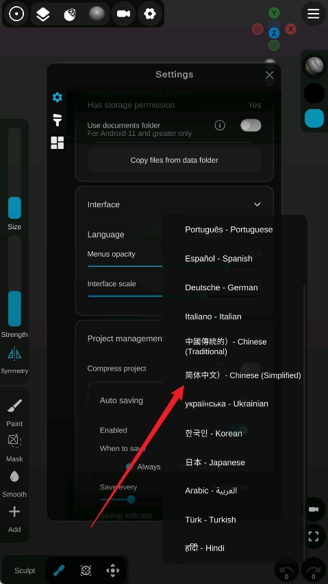 启动Sculpt+建模应用,进入主界面后,点击顶部齿轮样式的“设置”按钮,即可打开配置菜单。